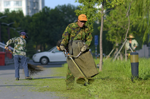 朝阳初现,从主校区西大门进来,一眼望去,地面整洁干净,道路两边的树木经过修剪、浇水,在早晨湿润的空气中显得更加充满生气,顿时神清气爽。在逸夫楼东边的草坪上,绿化组的工人们正推动着割草机进行割草作业、修整草坪。割草机的轰鸣声似乎是一曲曲交响乐,一曲下来,一小块空地的杂草就已经割完了。外环组的工人们早早就将校园清扫整洁,接着还分组对校园内的所有窨井清淤、排水管网进行疏通工作。拔草的工人们带着手套对校园的死角进行清理,打药水、拔草。