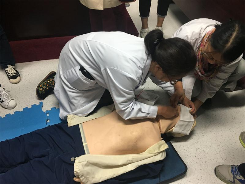 本次培训详细地介绍了AED(自动体外心脏除颤器)的使用方法和CPR(心肺复苏术)的具体操作。陈铭指出,当人在心脏病、溺水、车祸、高血压、触电时可能会导致心跳骤停,呼吸停止,都可以用心肺复苏术来抢救。AED主要用于心搏骤停患者的现场紧急抢救。目前中国平均每天约有3200人因为心脏原因猝死,其中70%发生在院外。心跳、呼吸骤停最佳抢救时间是发生后4-6分钟。心脏骤停后最常见的心律失常是室颤,而终止室颤,恢复正常心律的最佳方法就是电击除颤。电击除颤必须要由现场目击者争分夺秒完成。他强调,按目前国内院前急救医疗的实际情况,即便是在大城市也很难在黄金时间的最后一刻到达。如果现场目击者懂急救知识,参加过心肺复苏的培训,在第一时间对心跳骤停病人进行心肺复苏操作,就会有50%人能够被抢救过来。
