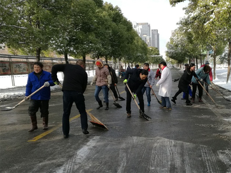 在扫雪除冰的过程中,大家一边扫着雪,一边提醒着过路的师生们:“小心路滑,慢点走,注意安全。”师生们听到后,露出了感激的笑容。
