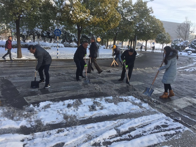 25日晚上,启秀校区有5人自愿留校,担心雪情严重,牺牲休息时间,舍小家为大家,一早就投入到校区范围内的清雪除冰工作中去。