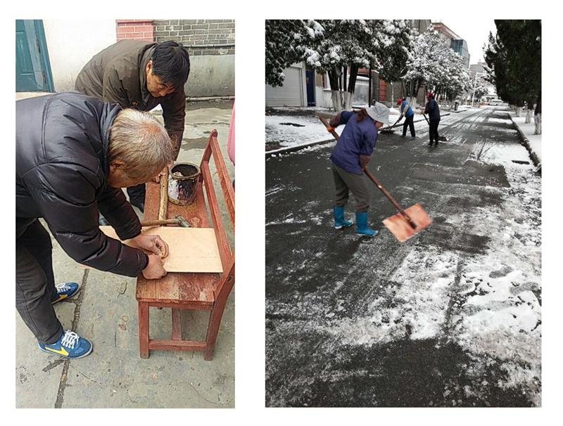根据气象台发布的较强雨雪降温天气,启秀校区绿化工陈国清、圣明杰自制推雪工具,铲雪时效率更高,确保校园道路安全通畅。