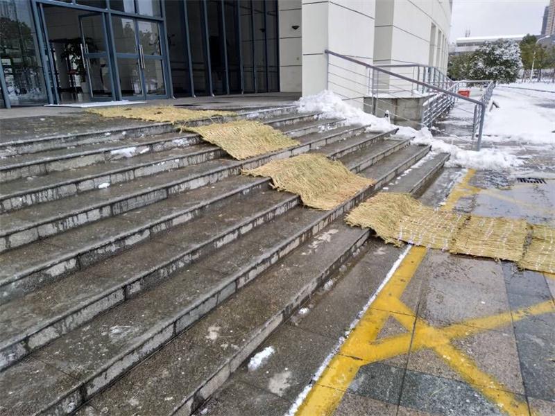 在逸夫楼、综合楼和图书馆等区域入口处,后勤保障部铺设了防滑草垫,目的是防止师生滑倒,小小的细节可见后勤保障部的贴心保障。巡查人员加大巡查频次,确保降雪期间和雪后校园内师生的安全。