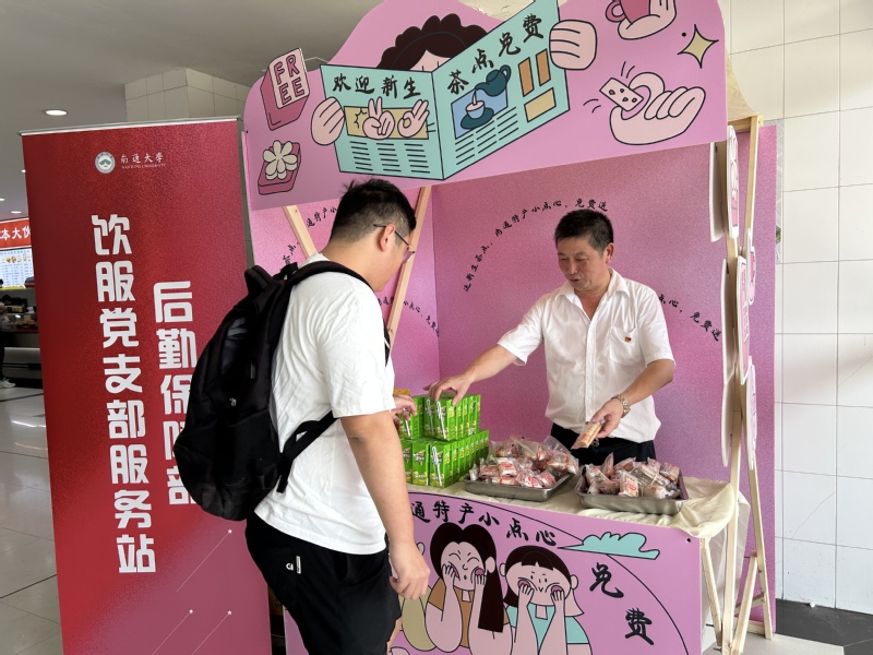 与此同时,各食堂门口的“新生加油站”也热闹非凡,成为新生和家长的“能量补给站”。支部精心准备了冰红茶、冰绿茶等清凉饮品免费供应,驱散天气的炎热,更特别推出云片糕、脆饼等南通特色小点,让初到校园的新生和家长在忙碌中品味地域风味,感受“家”的温情。这份无声的关怀,悄然消融了报到日的疲惫与陌生,拉近了彼此的距离。