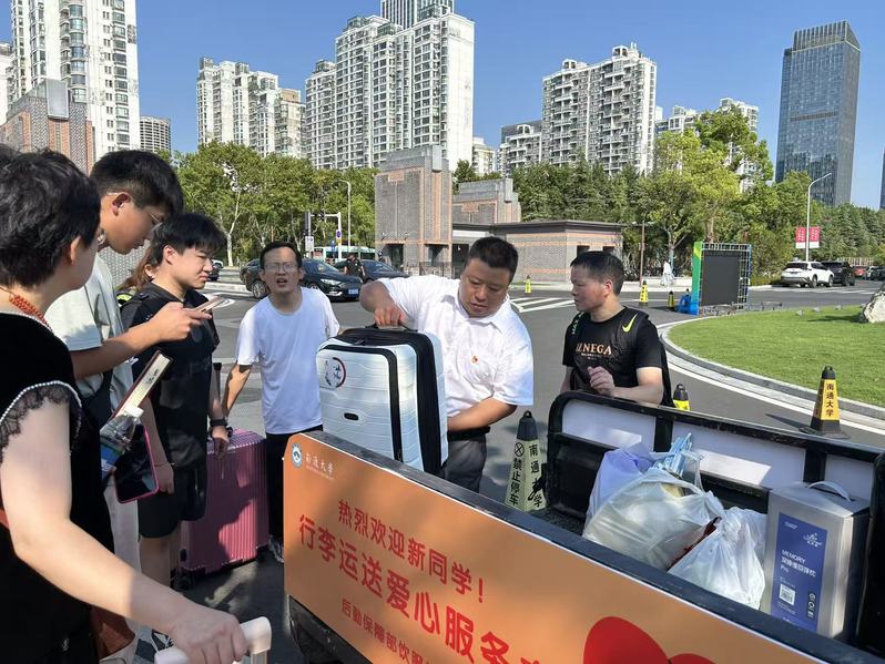 早上7:00,校门口的“行李运送爱心服务车”旁,党员同志早已分工就绪,主动迎上前,接过新生和家长手中的行李箱和背包。从校门到宿舍楼,他们一路护送、耐心指引,汗水浸湿衣背却步履不停。面对新生对校园环境的陌生与期待,党员们化身“贴心向导”,细致讲解教学楼、食堂、宿舍等关键位置,帮助新生快速熟悉校园环境。从踏入校门的第一步起,新生便感受到如家人般的守护与陪伴。