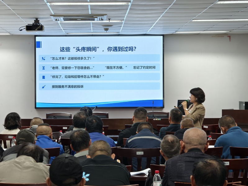 徐永以《维修站员工服务礼仪规范与标准》为题,围绕“共识:师生满意是我们最大的追求”“形象:第一眼就要专业”“沟通:让话语有温度”“流程:上门维修标准六步”“协作:跨班组跨部门交流”以及“应急:投诉与突发事件处置”等方面,开展了互动交流、情景模拟和角色扮演等多种形式的培训。培训内容生动实用,极具体验感,涵盖了如“电话接单三句原则”“仪容仪表六项标准”等多项实用技能,并融入了“服务不只是‘修东西’,更是‘解决问题+留下好印象’”“让标准成为习惯,让师生因我们而微笑”等理念金句,为员工带来很好的启发。