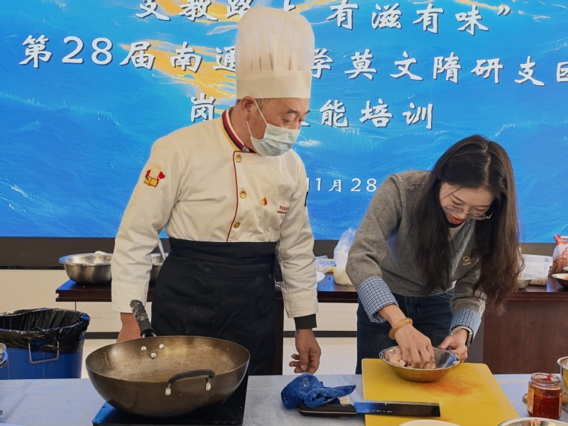 为提升我校第28届莫文隋研究生支教团成员实践能力,帮助他们在支教地安心生活、舒心教学,11月28日上午,校团委联合饮食服务中心在啬园校区三食堂三楼餐厅组织开展了“支教路上 有滋有味”岗前厨艺技能培训活动。