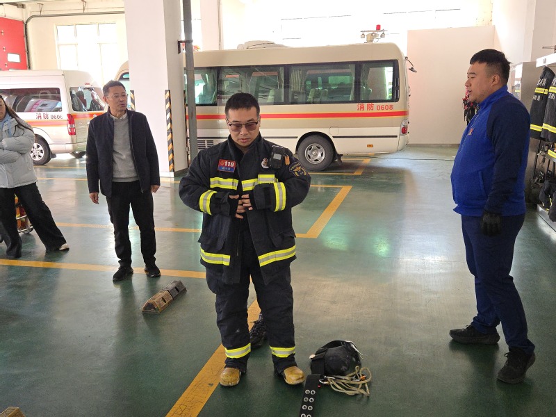 在消防救援站车辆装备区,贾旷玉为大家详细介绍了站内四辆消防救援车辆及其核心装备,从精密仪器控制台到各类防护装备,从专业救援工具到应急急救设备,全面展现了消防救援工作的专业性与严谨性。在装备体验环节,贾旷玉演示了消防救援服的快速穿着流程,部分商户代表现场试穿了重达80斤的消防装备。他介绍道:“这套装备在夏季穿戴如同蒸桑拿,但火场救援分秒必争,必须练就肌肉记忆。”亲身感受让参与者深刻体会到消防员工作的艰辛与责任。
