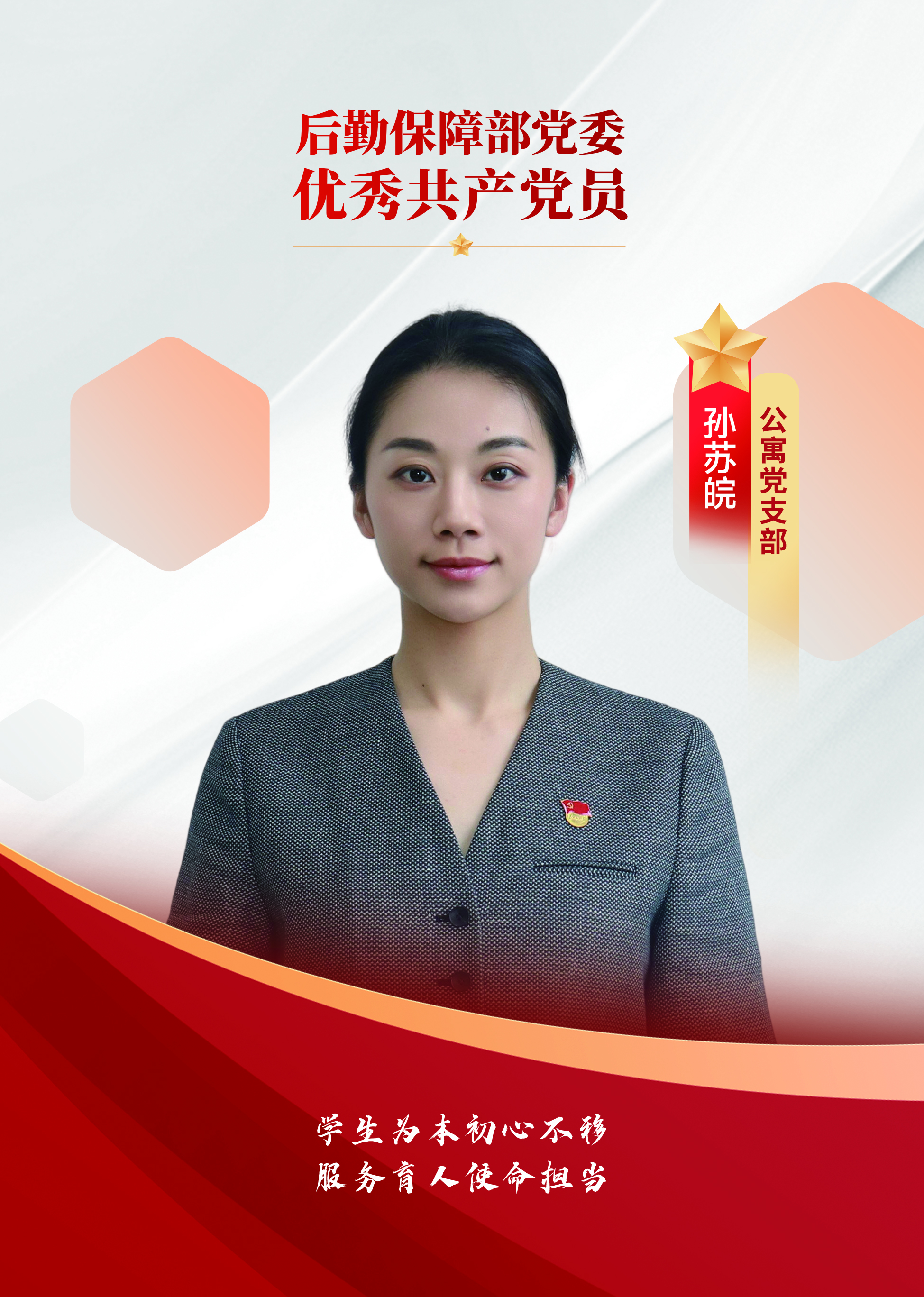 孙苏皖同志,曾任公寓服务中心班组长、公寓支部宣传委员,现任经营服务中心助理。她始终以高度的政治责任感与炽热的服务使命感,在看似平凡的工作岗位上,生动践行着党员的先锋模范作用,以日复一日的扎实行动,深刻诠释了共产党人的初心本色与时代担当。