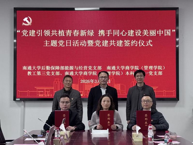 为深入贯彻落实习近平生态文明思想,扎实推动党建与业务工作深度融合,3月11日,后勤保障部能源与经营党支部联合商学院(管理学院)教工第三党支部、本科生第一党支部共同开展“党建引领共植青春新绿 携手同心建设美丽中国”主题党日活动暨党建共建签约仪式。后勤保障部党委书记徐惠忠、商学院(管理学院)党委书记邵春明出席活动。
