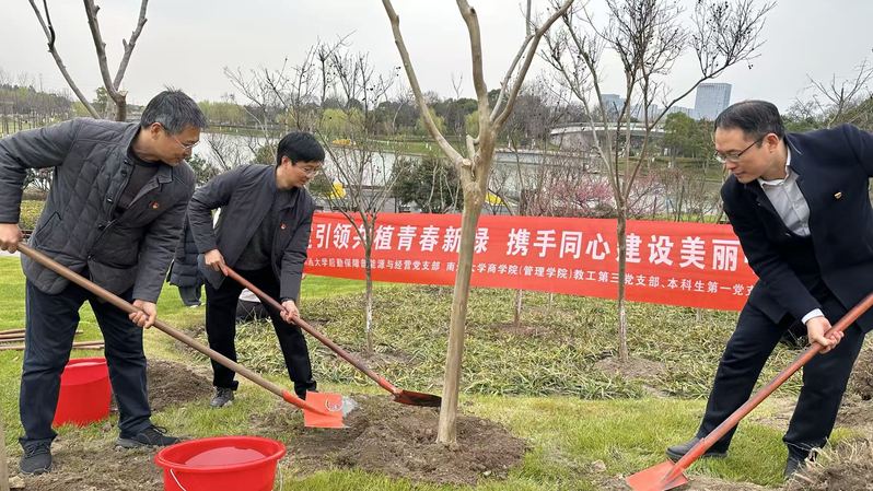 植树活动中,徐惠忠、邵春明率先垂范,党员们积极响应、迅速投入到植树劳动中。大家分工协作、配合默契,有的扶苗定位,有的挥锹培土,有的踩实固根,有的提水浇灌,处处洋溢着热火朝天的干劲。经过大家的共同努力,一株株新苗错落有致、迎风挺立,为春日校园勾勒出一抹盎然生机,也让“绿水青山就是金山银山”的发展理念在校园实践中落地生根。