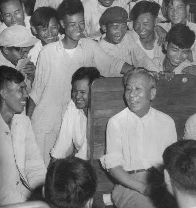 (刘少奇乘火车由天津去济南视察,途中与乘客亲切交谈)